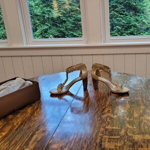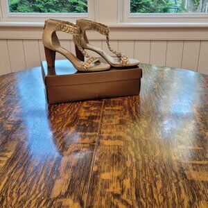 The elegant Adrienne Vittadini sandals feature eye catching, very comfortable straps, a back zipper and a 3-inch heel. They are crafted in gold sand color - they sparkle in sunlight! The shoes are extremely comfortable – they are soft and feature a slightly cushioned footbed, which along with the well-balanced, and not too high heel make them a great choice for occasions that require a lot of walking, or an entire night of dancing!