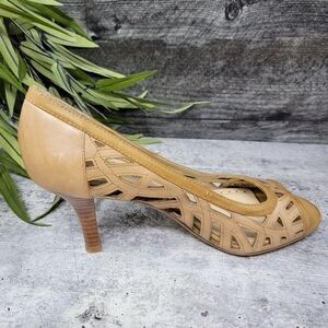 Adrienne Vittadini | Grandy Tan Leather Cutout Peep Toe 3" Heels Size 7