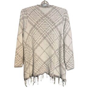 Adrienne Vittadini Gray Fringe Cardigan Sweater LARGE | Geometric Knit Boho Cozy