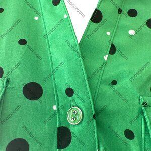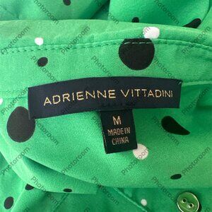 Fresh, bold, and playful, this blouse from Adrienne Vittadini brings a modern twist to a classic polka dot. The vibrant green background is covered in black and white polka dots of varying sizes, creating a lively pattern that feels both sophisticated and fun. The look is elevated with complementary green metal buttons that run down the front, as well as on the rolltabs for adjustable sleeve styling.