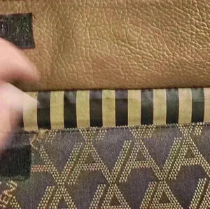 This stylish large tote in brown fabric with bronze genuine leather trim, zip closure across the top. Features multiple inside pockets including a zip pocket, a velcro laptop compartment, a strap to secure the bag on the carryon luggage for easy travel and another velcro secures large outside pocket. Pristine inside, no odor. Overall excellent condition-slight signs on wear on the handles only -see photo, otherwise pristine exterior.