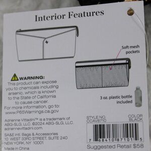 Features:• Rectangular design with zip-top closure• Interior divider with mesh slip pockets for easy organization• Includes one 3 oz plastic travel bottle• Gold-tone AV logo and plaque accents