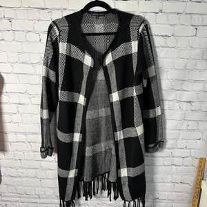 Adrienne Vittadini long open-front sweater in black and white herringbone pattern, size Large. Made from 100% acrylic, this stylish cardigan features a cozy knit and a playful fringe hem. Ideal for layering, it adds a touch of classic sophistication to any outfit. Excellent pre-owned condition, no visible flaws.
