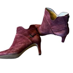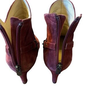 Suede, pointed toe, back zipper, 3” stiletto heels. Fun color. Gently used; there are a few scuffs on the back (most likely from driving). Great design and style.