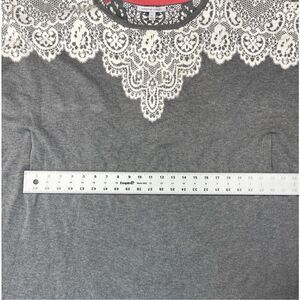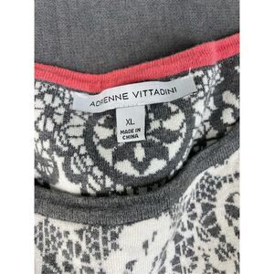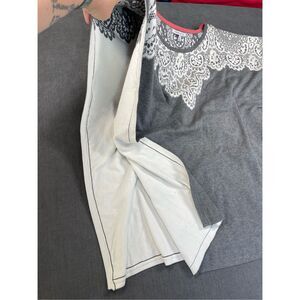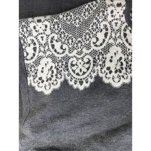 This Adrienne Vittadini poncho-style top features a soft gray knit body with an intricate white lace-look design across the shoulders and chest. The relaxed, oversized silhouette and open sides give it a modern poncho fit, perfect for layering or comfortable everyday wear. Please see photos for measurements.