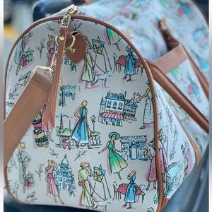 Omg, this print is adorable! Adrienne Vittadini Print Duffle with front pocket measuring 8” across and 7.5” deep, and interior zip pocket. Removable shoulder strap. Took on a couple trips so such slight wear. The inside has colored some where the metal studs are but it’s not seen during wear. Bag is 19.5” across and 12” deep at bottom, and 12” high.