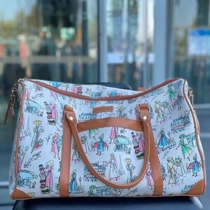 Omg, this print is adorable! Adrienne Vittadini Print Duffle with front pocket measuring 8” across and 7.5” deep, and interior zip pocket. Removable shoulder strap. Took on a couple trips so such slight wear. The inside has colored some where the metal studs are but it’s not seen during wear. Bag is 19.5” across and 12” deep at bottom, and 12” high.