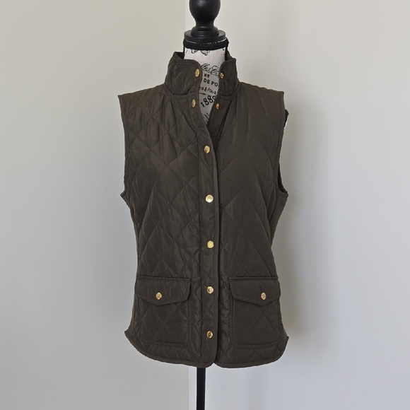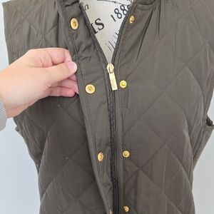 Stylish quilted vest. Features gold button accents. Perfect for layering.