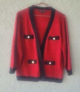 Elegant knit cardigan in burgundy red with black detailing. Ideal for a sophisticated style.