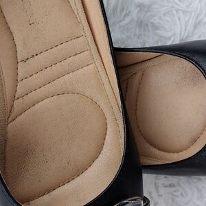 Adrienne Vittadini Saga Women's Black Fine Leather Upper Silver Chunky Chain Toe Detail Pointed-Toe Slip On Kitten Heel Pump Shoes. Man Made Balance. Padded Leather Sole. Light Toe Tip Scuffs. Footbed Wear. Sole/Heel Pad Wear. Measurement approx. Heel: 1". Size 6M Color May Vary Due To Lighting.