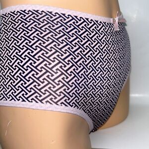 Adrienne Vittadini Slinky Satin High Waist Greek Key Asian Chinoiserie Print fabric light baby pink | dark navy blue panties size women’s Large . Brand New not worn . These feel like second skin. Lightweight. They are slinky microfiber satin extremely stretchy with the sweetest pink glossy satin bow at waistband. They almost have an inspired VERSACE Greek Key Print I think .. love these panties.