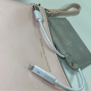 Adrienne Vittadini’s elegant wristlet with a sleek design. Perfect for versatile styling. Features a subtle logo detail and a recharging bank with attachments. This item is pre loved and has some blemishes. There is a red marking on the inside and a scuff mark on the back. Both are pictured. Item is sold as is.