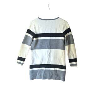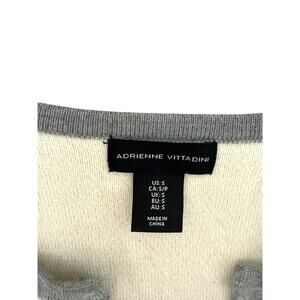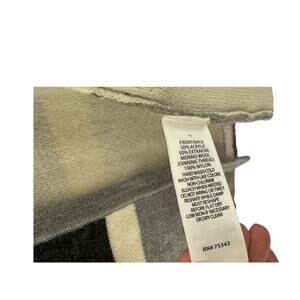 Classic Adrienne Vittadini striped open-front cardigan in gray, black, and white. Features bold horizontal stripes, long sleeves, front pockets, and collarless neckline. Size Small (US/UK/EU/AU S, CA S/P). Lightweight knit, perfect for layering at work or casual wear. Pre-owned, excellent condition with no holes, stains, or major flaws. Clean and ready to wear.