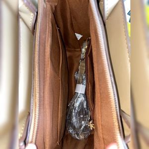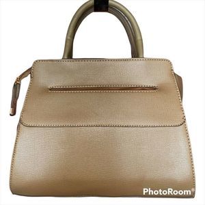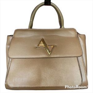 Adrienne Vittadini taupe colored medium sized satchel style handbag. Gold logo on front. Long strap still wrapped in plastic inside. In like new condition, if not new without tags.