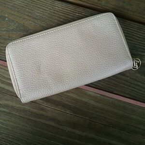 This wallet is new never carried in excellent condition. This wallet is a soft blush pink and has card slots, id slot, slot for bills and receipts, and a zip around section.