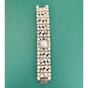 Make a bold yet elegant statement with this stunning vintage watch. Designed with a wide cuff bracelet band, it features dozens of Cabochon Lucite stones framed in gold-tone metal, accented with sparkling rhinestones. The square watch face blends seamlessly into the ornate design, creating a piece that is both functional and glamorous.