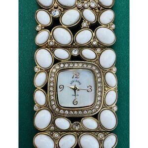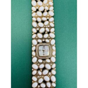 Adrienne Vittadini White Cabochon Lucite Goldtone Watch With Rhinestone Accents