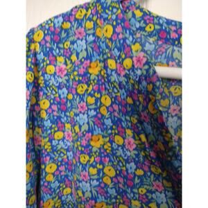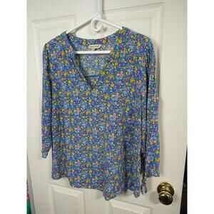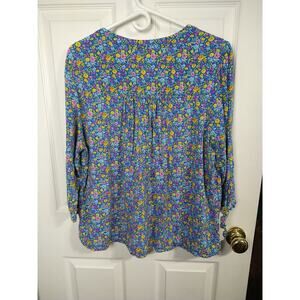 Adrienne Vittadini woman 1X pullover blouse in excellent condition no flaws. Slit tie 3/4 sleeve blue background yellow pink blue floral v neck print. Lightweight flowy pintucks back