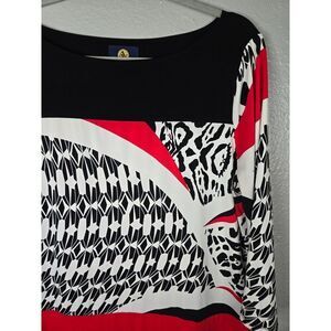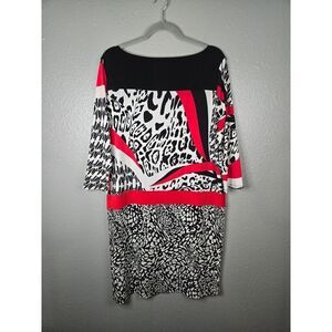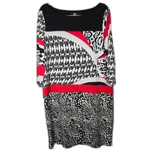 Adrienne Vittadini Women's Black, White and Red 3/4 Sleeve Sheath Dress. Boatneck. Color Block and Mixed Patterns. Lightweight and Stretchy. 95% Polyester; 5% spandex. Workwear. Chic. Party. Going Out. Pit to Pit: 21.5"; Length: 39.5" (measurements approximate). Size Large. Excellent used condition.