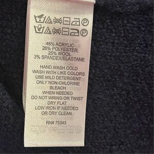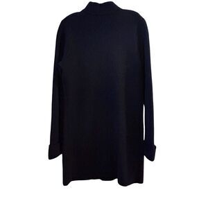 This Adrienne Vittadini jacket in size large is crafted from a blend of acrylic, polyester, wool, and spandex/elastane, offering a comfortable fit. The Blue basic jacket features a long length with padded shoulders and front pockets, accented with rhinestones. It has a silk lining and a button closure, suitable for both casual and formal occasions. Made in China, it requires hand washing. The jacket is pre-owned but in excellent condition.