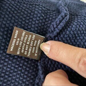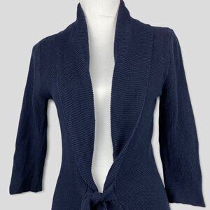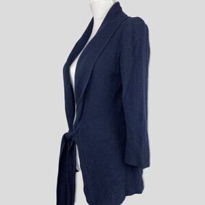 Adrienne Vittadini women's size medium cardigan, color is navy blue, 3/4 sleeves, fold-over collar, mid-length, stretchy, soft thick knit dot pattern and tie front closure. Materials 100% cotton. Care machine washable lay flat to dry. RN#107231 Condition is preloved very good as shown in the pictures. Please preview the measurements to ensure fit. Size 6 dress form used in photos.
