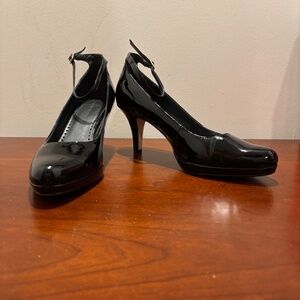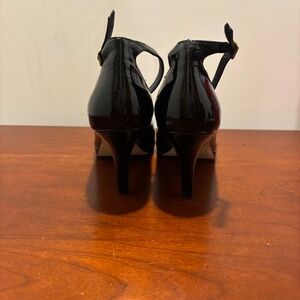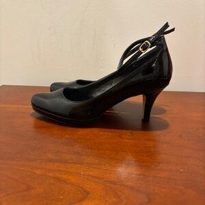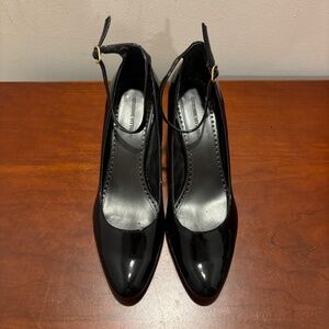 Adrienne Vittadini Parma pumps in black. Adjustable buckle ankle strap. Women's size 9. There are some scuffs to sides and front toe area.