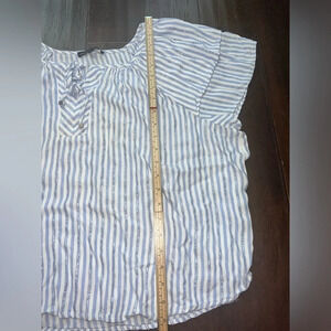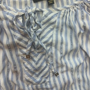 Elevate your summer wardrobe with this chic Adrienne Vittadini striped blouse. Crafted from lightweight fabric, this top features a stylish blue and white stripe pattern with subtle metallic threads for a touch of sparkle. The elasticized neckline and flutter sleeves add a feminine touch, making it perfect for casual outings or dressing up with accessories. This blouse is a size 2X, ensuring a comfortable and flattering fit. In excellent condition, ready to be your new favorite top.