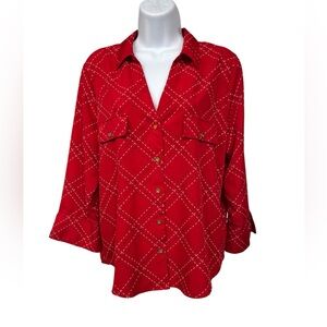 Lightweight red blouse with black & white dotted lines pattern. V-neck button down with 3/4 sleeves.