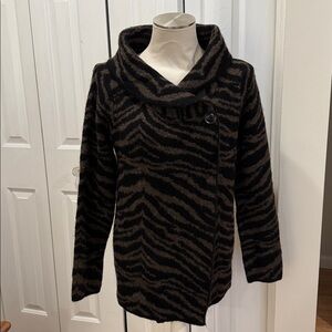 Black and brown wool blend cardigan sweater with a bold animal/zebra/tiger pattern. Very flattering collar/neckline.