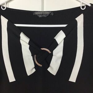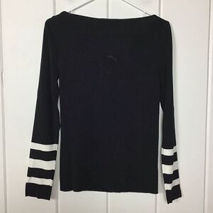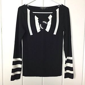 Adrienne Vittadini black top with black & white striped finish on sleeve hems and in the front. Front center also has a silver circle detail. Size - Small. 63% viscose, 37% polyamide. Beautiful fitted top in great shape!
