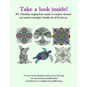 50+ Mandalas ranging from simple to complex, themed, and animal zentangles. Suitable for all ages 12 and up.