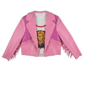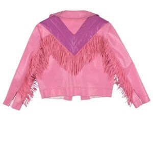 Made of pink faux leather with fringe trim