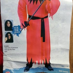 New with package Adult Unknown Phantom Halloween costume. One size fits up to 6 Foot, 200 lbs. Includes robe with attached hood, one way mesh mask and belt.
