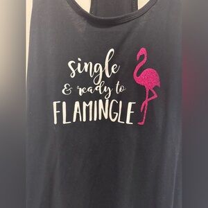 Stay stylish with this black tank top featuring a fun flamingo graphic. Perfect for casual outings. Adult Small ‘Single and Ready to Flamingle” Graphic Tank Top in Black