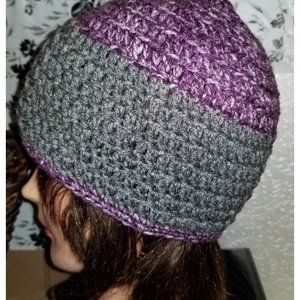Unisex Adult Teen Beanie Hat Grey Purple Heather Crochet Knit Winter Watch Cap Vegan Wash Dry Stretchy Great Gift Winter Men Women