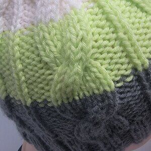 ⭐Adult Unisex Handmade Pom Beanie Cable Knit Color Block Grey Green Winter Hat