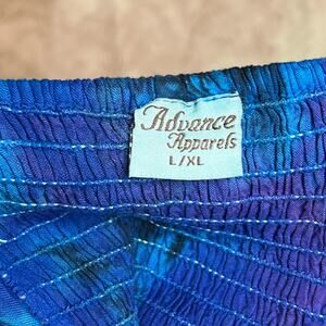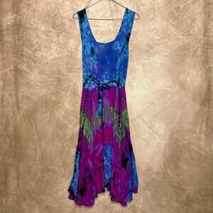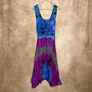 Blue, purple & green tie dye dress, sleeveless, round neckline with a lace up bodice. Back of torso has a smocked/ruched stretchy fabric, back has waist tie closure, and handkerchief style hem.