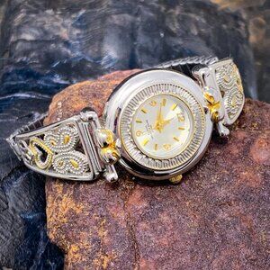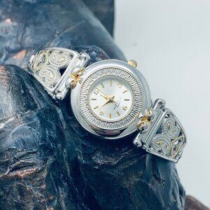 Advance Silver/Gold Round Heart/Butterfly Filigree Panel Stretch Band Watch