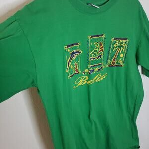 The shirt has short sleeves and a crew neckline, making it perfect for a casual day out or a day at the beach. The shirt is also a vintage piece, adding to its unique charm. It is a green color and has a solid pattern with a graphic print. The shirt is from Belize, making it a great souvenir for anyone who has visited the country. 28" long 21" pit to pit