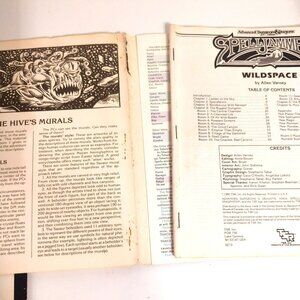 Advanced Dungeons & Dragons 2nd Edition Legend of Spelljammer Maps. Condition is preowned. Wildspace booklet has significant wear at the ages and cover is loose. Includes summary of NPCs, some maps (which not sure if they are from wildspace itself), 12 cards of various ships. Cards have yellowing and some stains. Set looks to have been well played. (PM02)