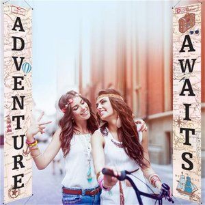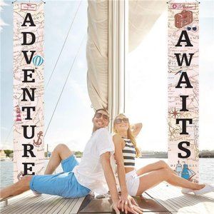 🧿Travel themed decoration banner set: "Adventure" banner, 12 x 72 inch (LW), "Awaits" banner, 12 x 72 inch (LW), celebrate the beginnings of a new adventure, fit for travel theme party as a welcoming front door sign or party decoration; Warm notice: Make sure the size and masure your party space before buying the banner