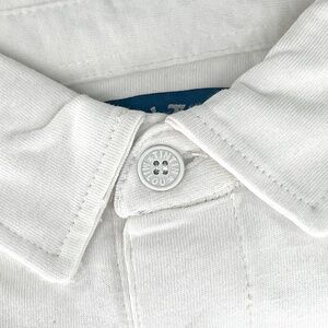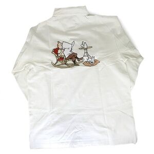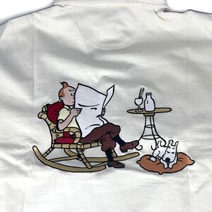 This long sleeve polo from "The Adventures of Tintin" comic series features an embroidered image of Tintin on the front left side. On the back of this cream colored shirt is a large embroidered image of Tintin reading in a chair with Snowy sleeping at his feet. The rubber buttons on the shirt have written "Tintin et Milou" on them. This polo was bought in Japan in 2000 and is like new...never worn, only washed once. Still has tag attached. It is marked small but wears like a medium...it's a big small. Great shirt.