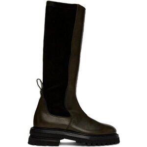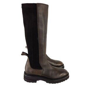 Calf-high paneled buffed leather, grained leather, and suede boots in brown and black.
