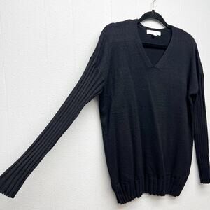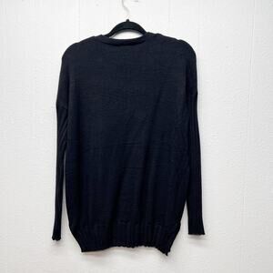 Adyson Parker women's black knit sweater. Pullover. V-neck. Drop shoulders. Long ribbed sleeves. Ribbed hem. Side slits. Long length. In good used condition. No stains, tears or holes.
