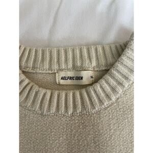 Aelfric Eden “Skeleton Portrait” jacquard knit sweater in beige with black artwork. Ribbed crewneck, cuffs, and hem; long sleeves; mid-weight knit; oversized streetwear fit.