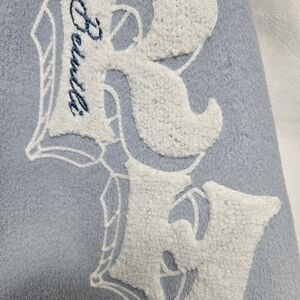 Aelfric Eden bomber jacket in sky blue and white. Features bold patches and lettering. Ideal for a trendy look.
