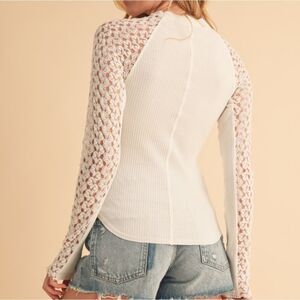 Design Details: Mock neckline, lace sleeves, crochet sleeves, raglan sleeves, ribbed body
