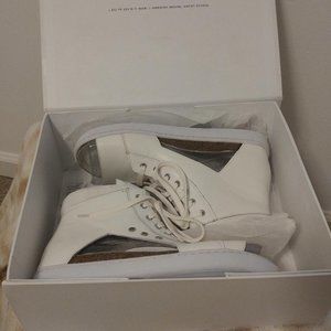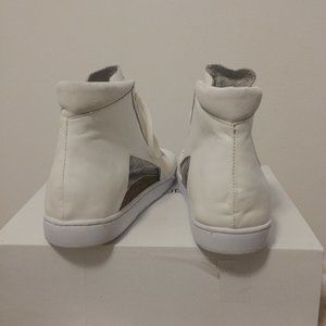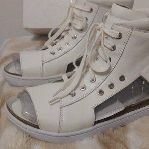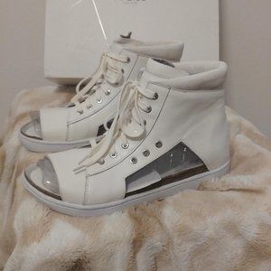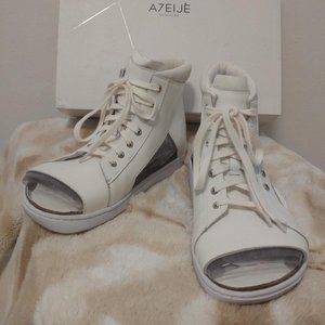 White Waxy Aeria Nappa Leather Peep-Toe Sneaker by A7ELJE Misses Size 10M in original box. Edgy cutouts upgrade these leather lace-up hi-tops stacked on a cork platform and chunky rubber sole. A contoured foot bed lends a custom fit. 1.38'' heel with 0.75'' platform. 7'' shaft. 10'' circumference. Lace-up. Leather upper. Leather lining. Contoured foot bed. Rubber sole. Never worn.