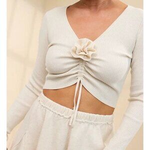 Aerie AE Pink Ribbed Knit Rosette V Neck Long Sleeve Ruche Tie Crop Sweater