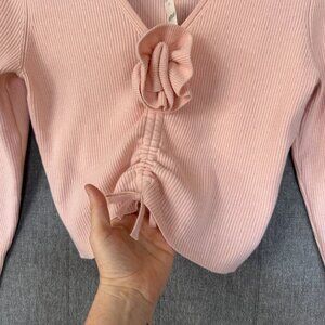 Aerie AE Pink Ribbed Knit Rosette V Neck Long Sleeve Ruche Tie Crop Sweater Size Large